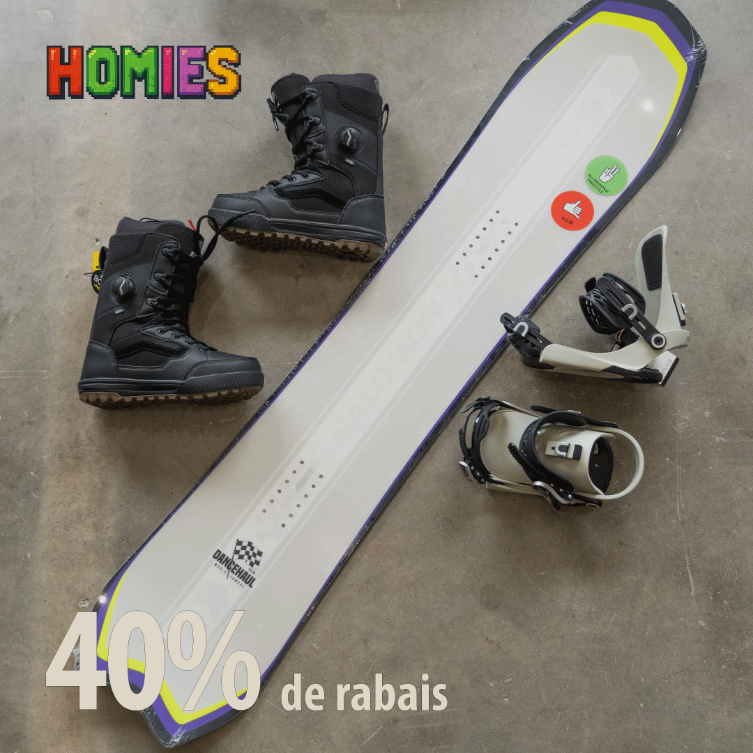 Tu pensais que t’avais tout vu? Pour l’hiver 2026, on lance une série d’initiatives pour te simplifier la vie, rendre ton équipement plus accessible et te donner encore plus de raisons de rider tout le temps! Au cœur de ces nouveautés : le crédit-reprise. Ramène ta vieille planche, repars avec une neuve, et profites-en pour t’équiper comme il faut pour la saison. Crédit-reprise : ton vieux board peut encore te servir Cet hiver, on lance un projet pilote : le crédit-reprise. Le principe est simple – ramène ta planche (3 ans ou moins, d’une marque qu’on vend) et obtiens un rabais instantané à l’achat d’un board 2026. Pas de note de crédit, pas de délais. Juste une façon directe et accessible de passer à du matériel plus récent. Les planches reprises seront revendues à prix doux à d’autres passionnés. Une façon de faire rouler l’équipement, de freiner la surconsommation et de garder plus de riders bien équipés sur la montagne! Seulement 20 places disponibles cet hiver – on teste le terrain avec un service personnalisé, fluide, et toujours ancré dans notre expertise. Que tu sois nouveau sur une planche ou rider aguerri, c’est l’occasion de mieux rider pour moins cher. À retenir : Valide uniquement sur l’achat d’une planche 2026 Ta planche doit avoir 3 ans ou moins Seules les marques vendues chez Homies sont acceptées Board pour board uniquement (pas valide sur bottes ou accessoires) La décision de reprise revient à notre équipe sur place Le rabais est appliqué immédiatement, en magasin Aucune note de crédit, aucun report Offre non jumelable avec d’autres promos 20 places seulement pour l’hiver 25/26 Billet de ski gratuit : Vali ou Mont-Ed Les 100 premiers à acheter une planche 2026 en boutique recevront un billet de ski gratuit pour le Vali ou le Mont-Ed. Une planche neuve et une journée en montagne, ça commence bien l’hiver. Offre valide en magasin uniquement. Un entretien gratuit Quand tu repars avec un board 2026, on t’offre un entretien complet – cirage et aiguisage inclus. On the house! Tu commences la saison avec une planche qui glisse à son plein potentiel. Offre valable en boutique seulement. Vente privée avec un pro Besoin de conseils pour choisir ta planche ou optimiser ton équipement? Tu peux maintenant réserver une vente privée avec l’un de nos conseillers snow. Sur place ou par téléphone, on prend le temps de jaser avec toi, pour t’aider à trouver le setup qui te convient vraiment. Disponible en magasin ou par téléphone. Réserve ta plage horaire ici. Pourquoi passer chez Homies cet hiver? Parce qu’on connaît le terrain. On ne fait pas juste vendre des boards, on ride avec. Le crédit-reprise, c’est notre façon de garder ça accessible. Les billets de ski, l’entretien gratuit, les conseils personnalisés – tout est pensé pour que t’arrives sur la montagne équipé, confiant et prêt à rider.