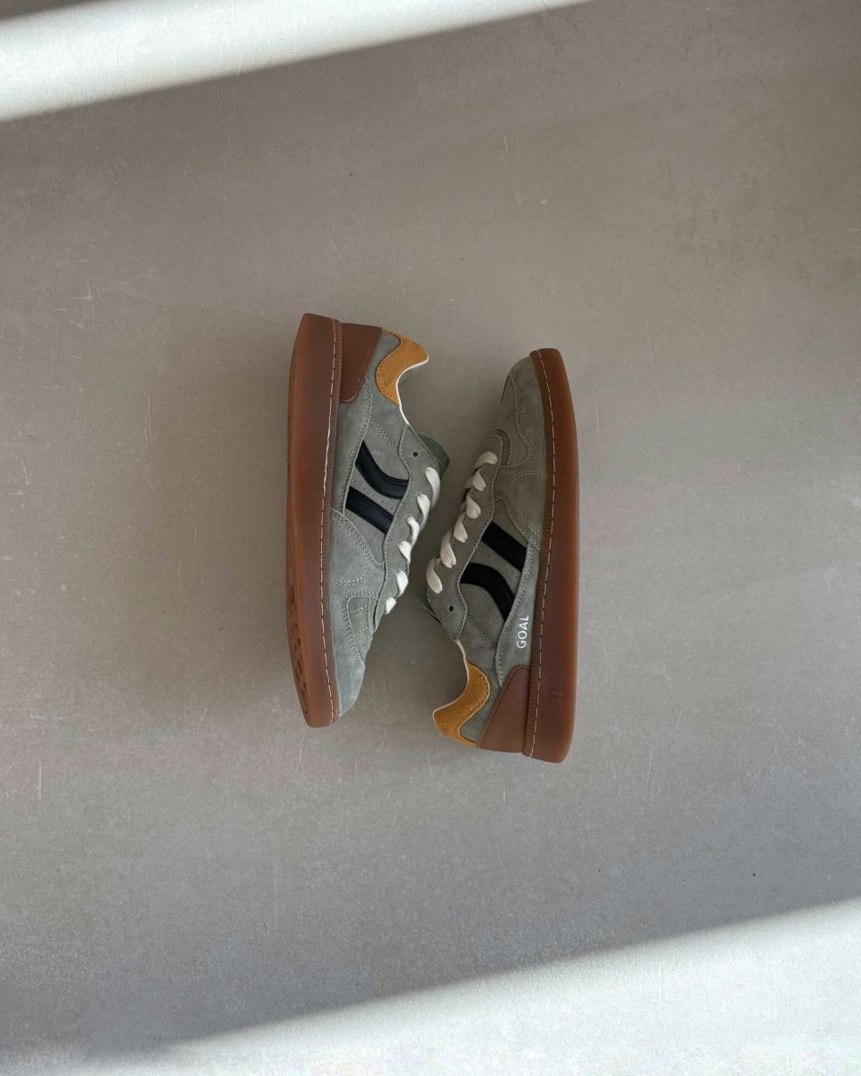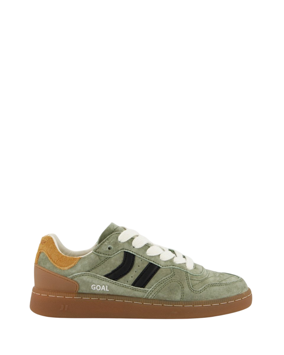Suede sneakers with a retro design, enhanced with contrasting details. Featuring a pre-shaped leather tongue with sculpted padding and a lightly padded collar, it reveals an exposed leather lining. The flat two-tone cotton laces can be interchanged as desired. Stitch reinforcements at the front and a flexible rubber sole ensure both grip and durability. The model name "GOAL" appears on the side in an antique gold finish.