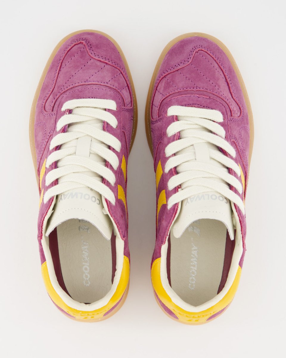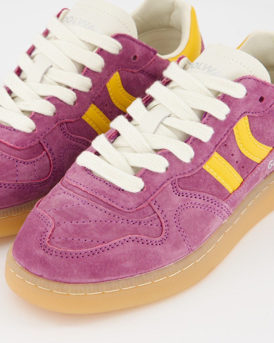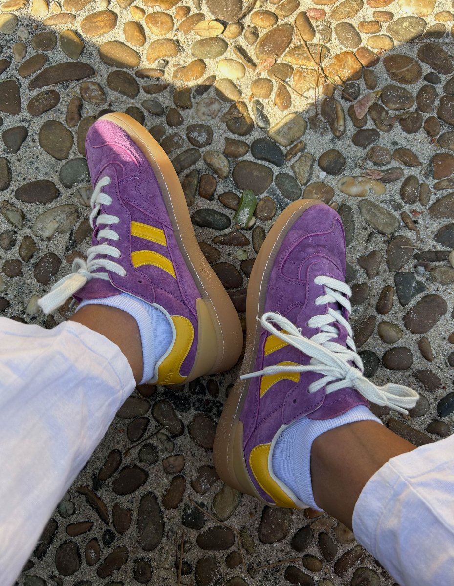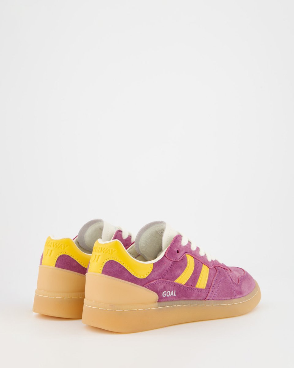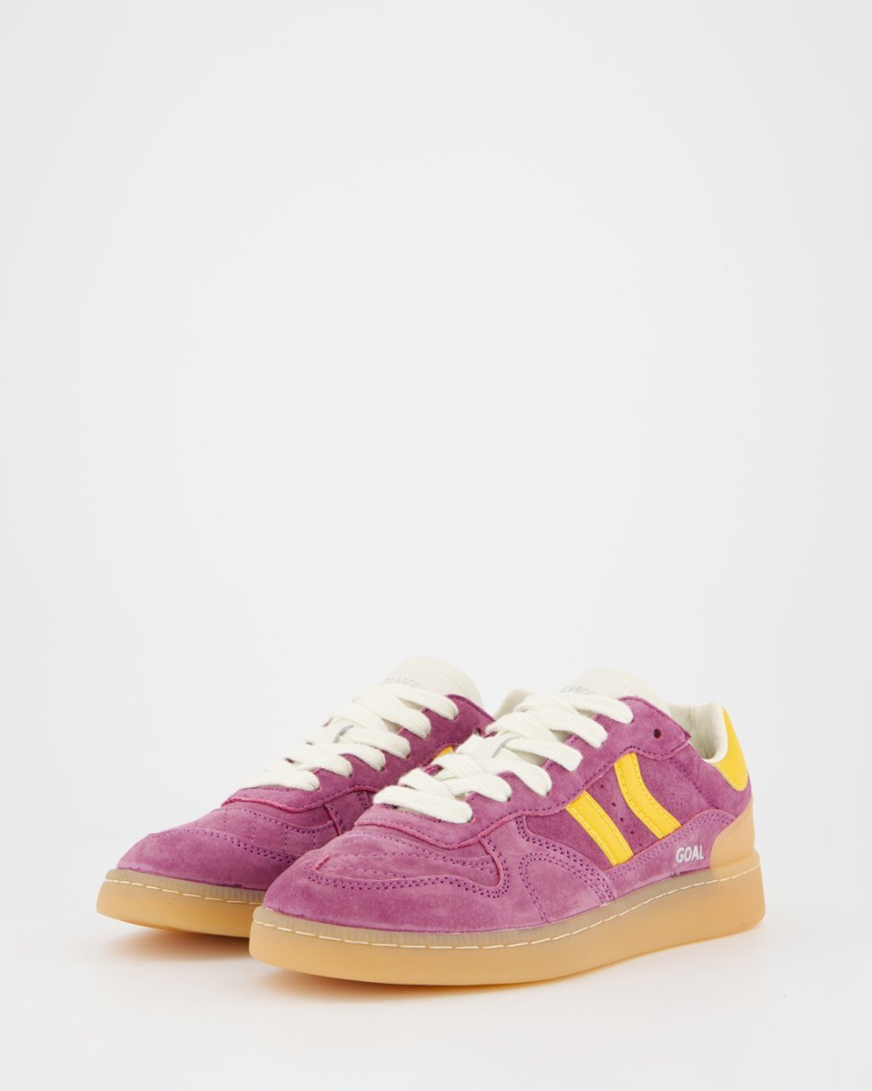 Suede sneakers with a retro design, enhanced with contrasting details. Featuring a pre-shaped leather tongue with sculpted padding and a lightly padded collar, it reveals an exposed leather lining. The flat two-tone cotton laces can be interchanged as desired. Stitch reinforcements at the front and a flexible rubber sole ensure both grip and durability. The model name "GOAL" appears on the side in an antique gold finish.