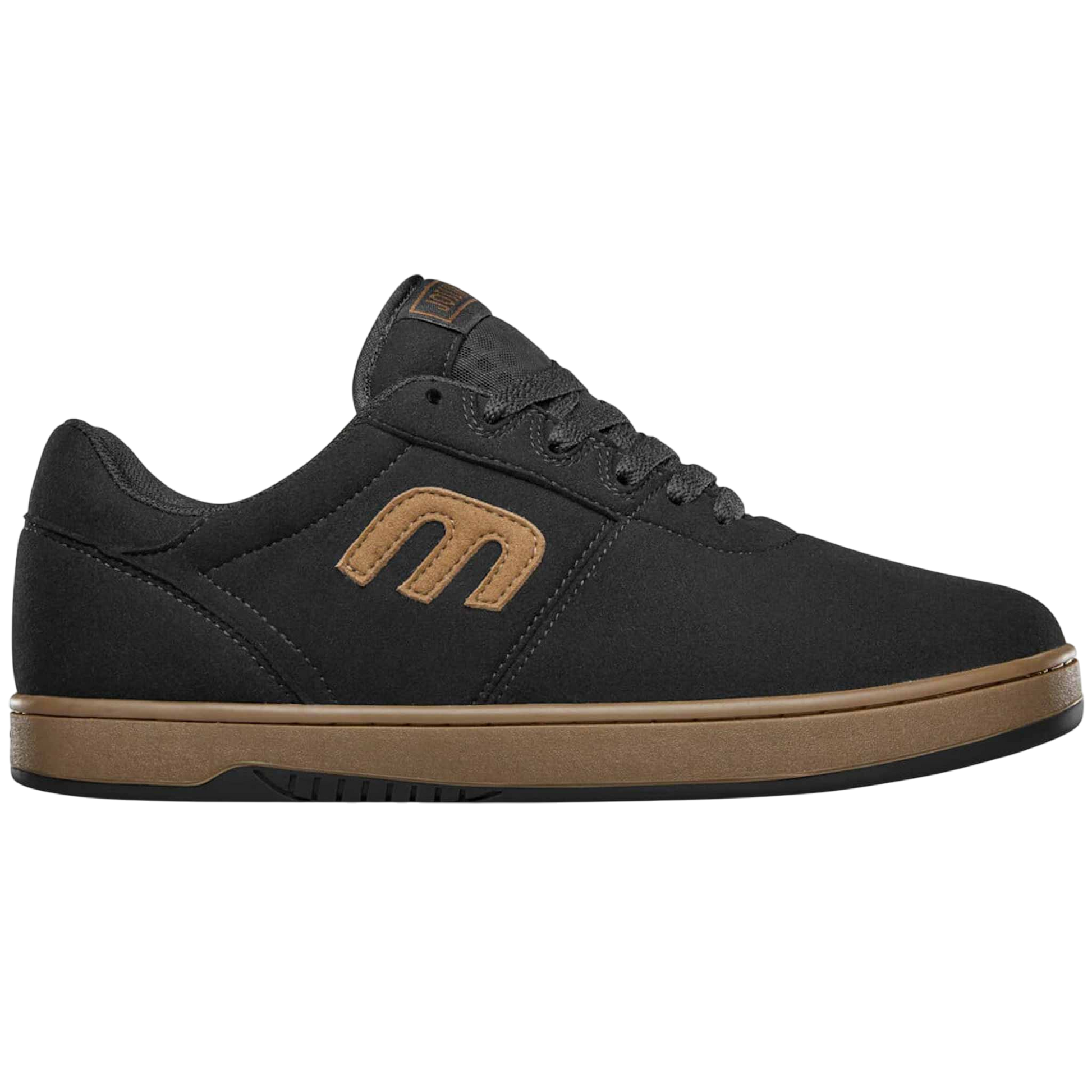 The Etnies Wallen shoe in black and brown features a Pro Foam insole, Michelin tread, hidden lace loops, and a snug fit for all-day comfort.