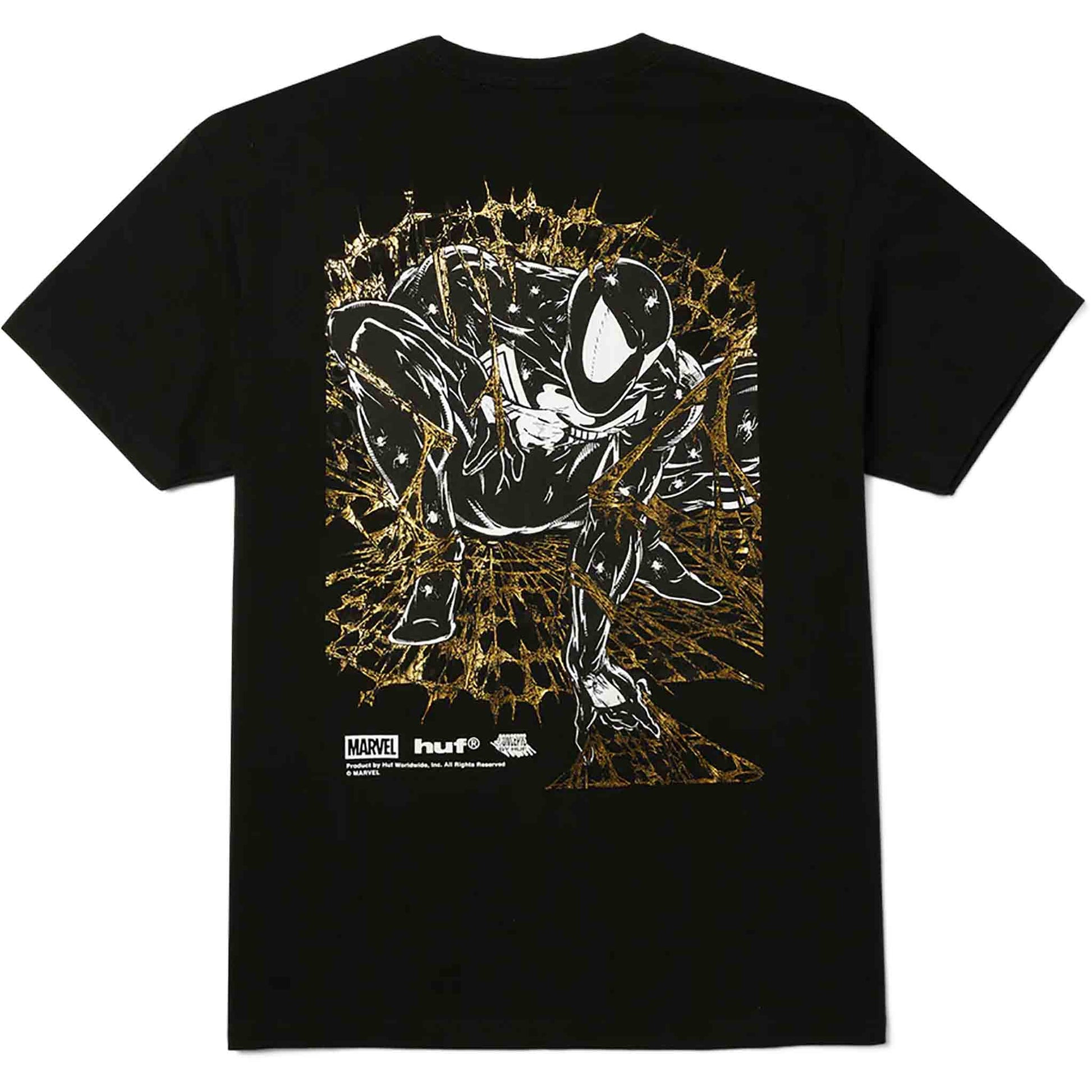 The HUF x Marvel Spider-Man Arachknight T-Shirt unites the worlds of skateboarding and superheroes in an exclusive collaboration. Made from 100% cotton, this short-sleeved design features a graphic print on the center chest and back, with a gold foil detail that enhances the Spider-Man design. HUF x Marvel co-branded details complete this collector's item, perfect for fans of style and comics.