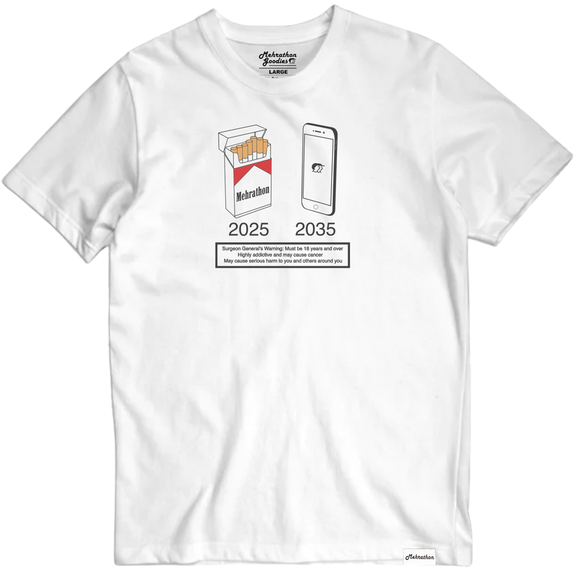 Avec un visuel aussi percutant qu’ironiquement visionnaire, le t-shirt Hindsight blanc de Mehrathon interroge notre rapport à la dépendance moderne. En comparant un paquet de cigarettes (2025) à un smartphone (2035), il détourne les codes des avertissements sanitaires pour livrer un message critique sur l’addiction technologique. Une pièce au graphisme minimaliste mais au propos fort — à porter comme un statement.
