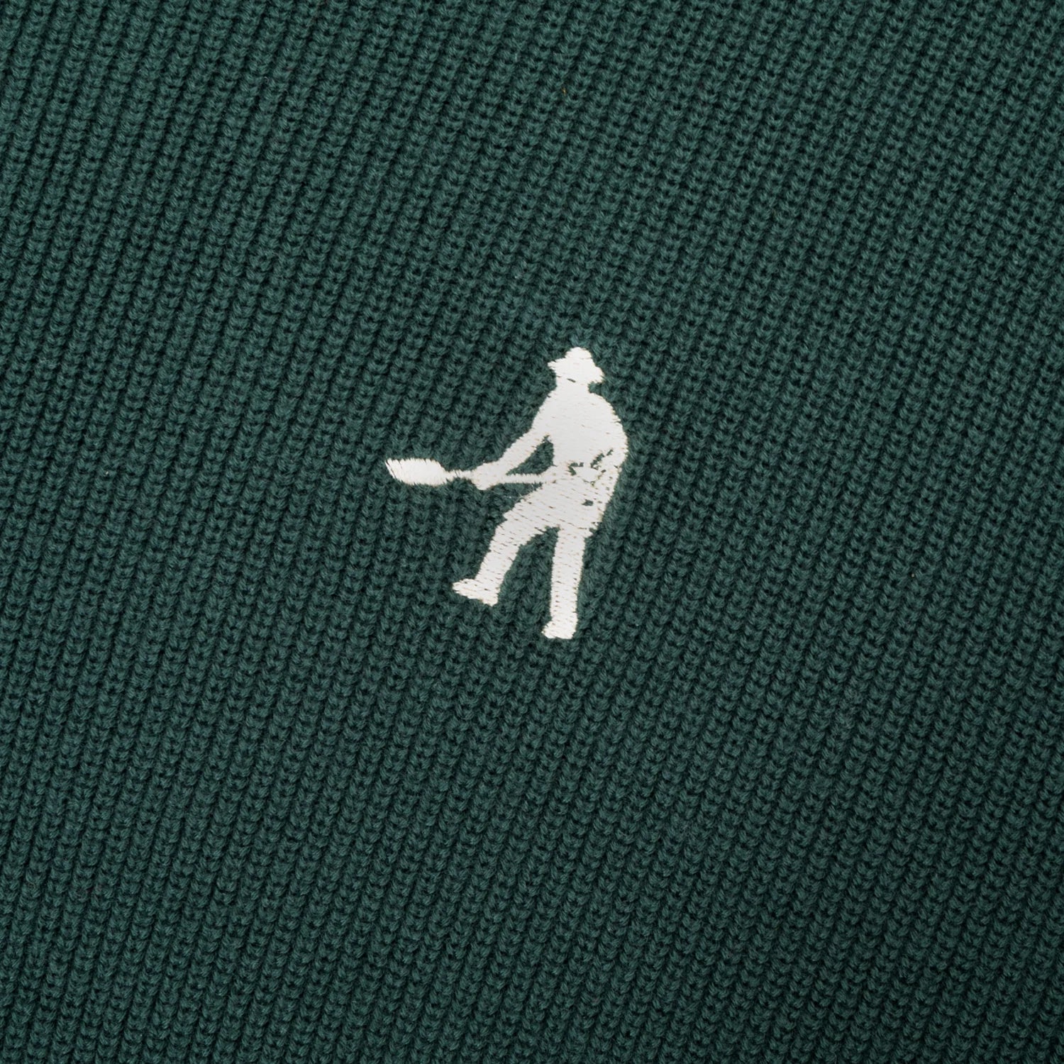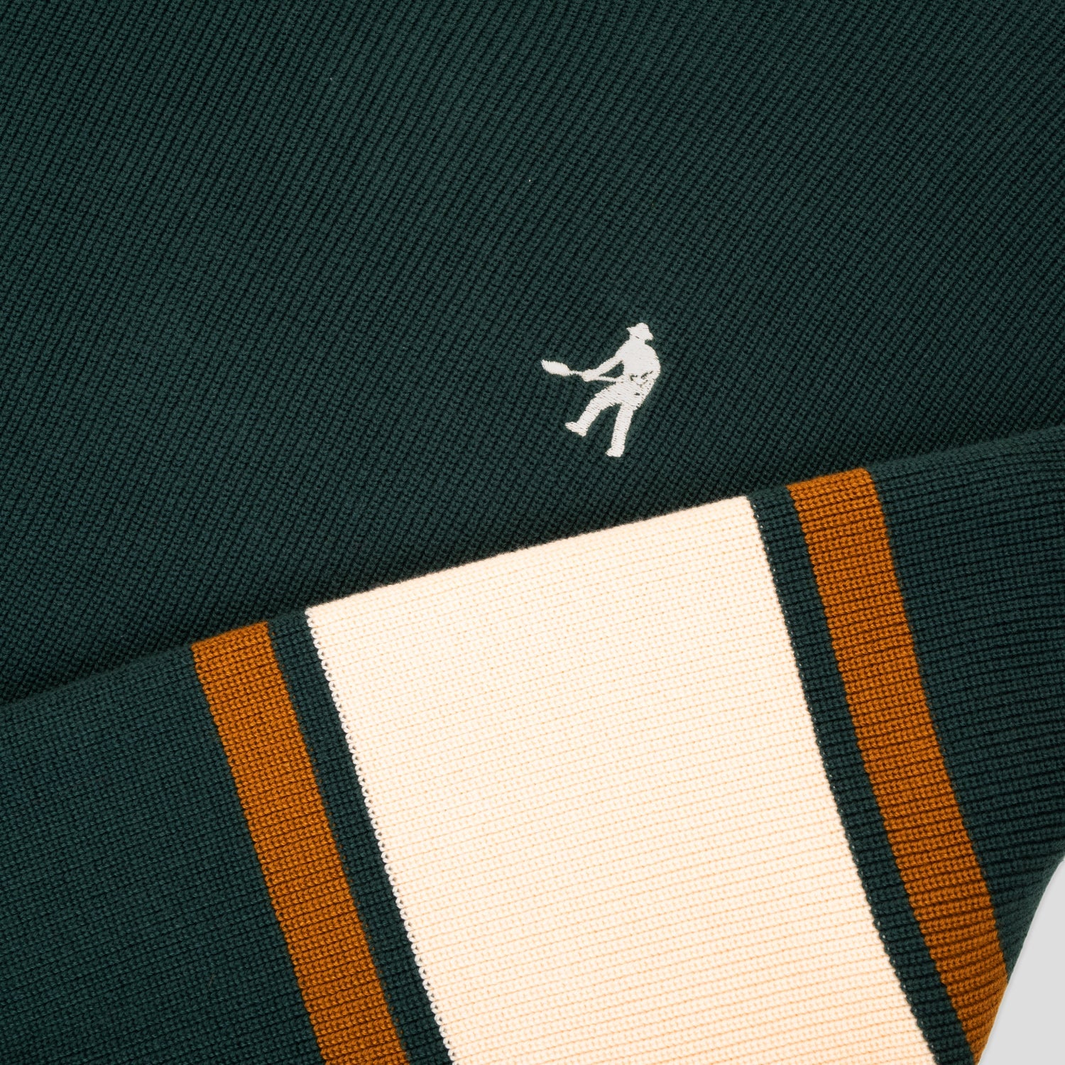 Part of the #45 range and the "Organic Department" line, this Pass~Port organic cotton knit sweater impresses with its bold style and meticulous finishing. Made from 100% organically grown cotton, it features direct "digger" embroidery on the front and contrasting jacquard stripes on the sleeves. Its dark green hue and natural texture make it a comfortable, sustainable piece full of character.