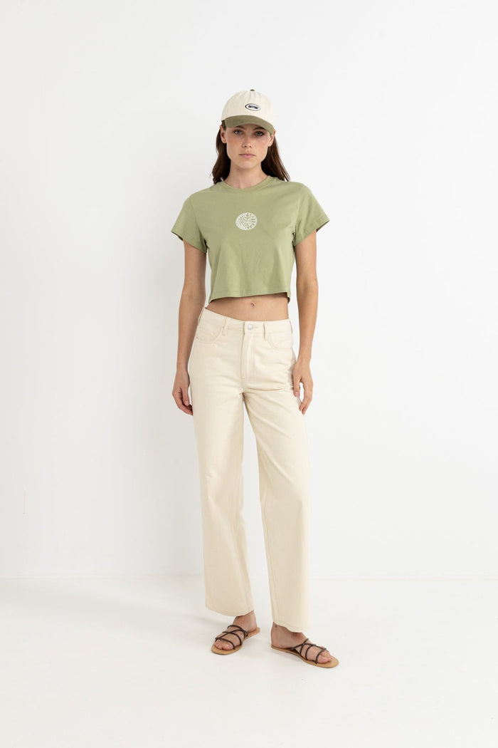 RHYTHM Garage cap in olive, made from durable cotton canvas with a contrasting visor. Featuring artistic embroidery on the front and a custom fit with a metal buckle on the back, it combines comfort with casual style.