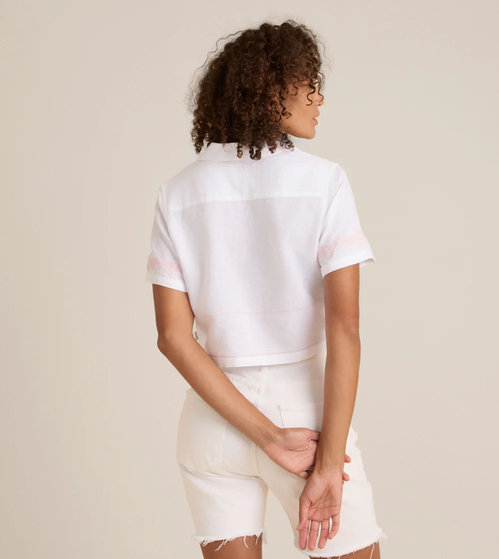 The devil is in the details, and that's why we love the Camp T-shirt. Embroidered with symbols of our quest for the Fountain of Youth, this simple and relaxed linen cropped tee reminds us of the good old days. With its cropped length and front darts for a more tailored fit, you won't be disappointed.