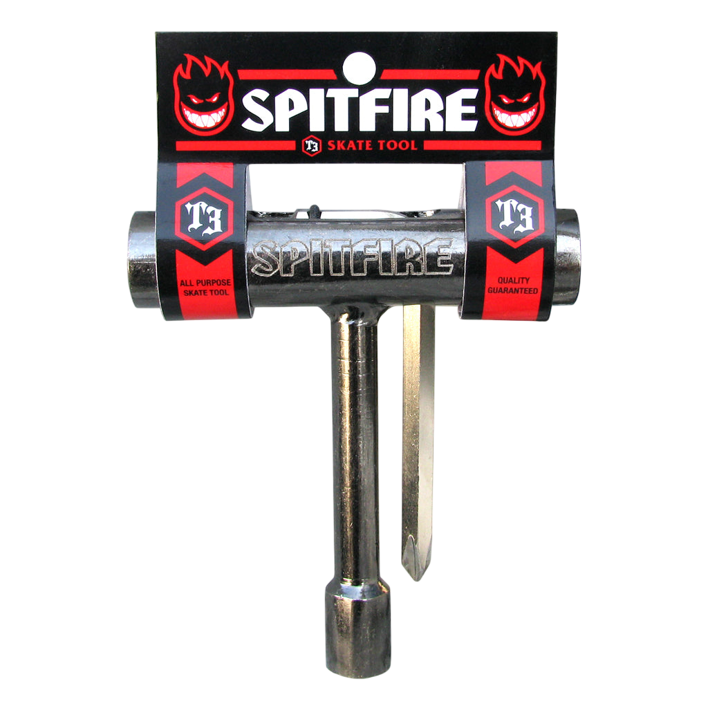 The Spitfire T3 Skate Tool is the only tool you need. It features a removable Phillips wrench, a 1/8" Allen wrench, and enough sockets to adjust your entire board. The gold branding adds a touch of elegance.