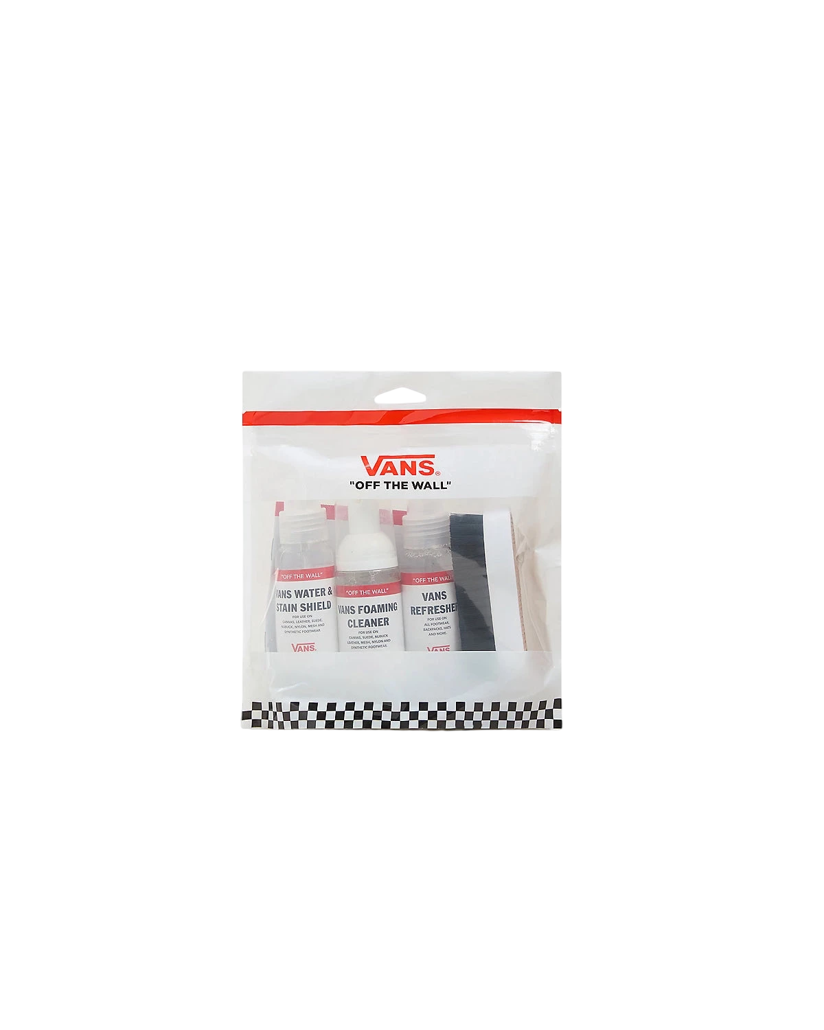 The Vans Shoe Care Travel Kit includes three travel-sized versions of Vans shoe care essentials in a resealable bag: the Water & Stain Shield, the Foaming Cleaner, the Refresher, and a shoe-shaped Vans shoe brush. The Vans Water & Stain Shield is specially formulated to provide an invisible barrier against moisture and stains and is ideal for leather, suede, nubuck, cotton, canvas, and nylon shoes and accessories. The Vans Foaming Cleaner is specially formulated to remove dirt and stains from Vans shoes, keeping your Vans looking like new. It is ideal for cleaning white rubber and can also be used on uppers and soles. The Vans Refresher is formulated to freshen and deodorize shoes and is a great way to keep your shoes and accessories fresh. The Vans Shoe Brush is a safe and effective way to remove stains and dirt.