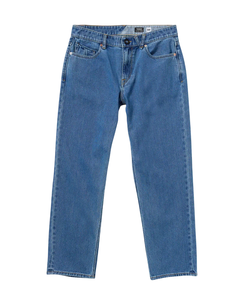 Jean en mélange de coton doux et de polyester recyclé avec coupe fuselée décontractée, jambe de 16 pouces. Processus de lavage écologique, délavage indigo d'inspiration vintage, surpiqûres anthracite. Notre style signature Volcom, un confort décontracté ultime.